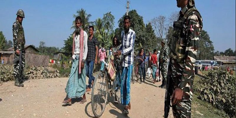 Villagers walk past CRPF troops patrolling a road ahead of the publication of the first draft of the National Register of Citizens in Nagaon in December. | Anuwar Hazarika / Reuters